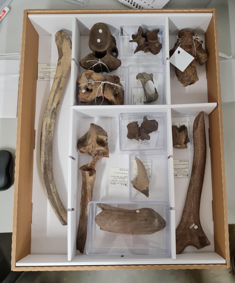 Fortunately, we all like puzzles and tetris, because every now and then you have to be pretty creative to get as many bones in the box as possible without them lying on top of each other. And some of the time also goes into folding the boxes and compartmentalizing. Fortunately, we have the space in the geolab, because for this work you quickly need a wide table per person to lay out your stuff.