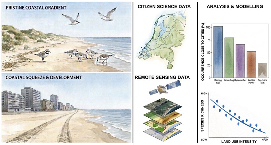 By combining high-density citizen science bird data with remote sensing and spatial environmental information, this project will investigate how habitat quality and coastal management shape bird diversity patterns along the Dutch coast.