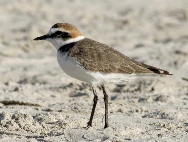 A Kentish Plover (Charadrius alexandrinus) on a sandy beach. This species is one of many that rely on dynamic coastal transition zones for nesting and feeding, making it a key indicator of habitat quality and management impacts along the Dutch coast.