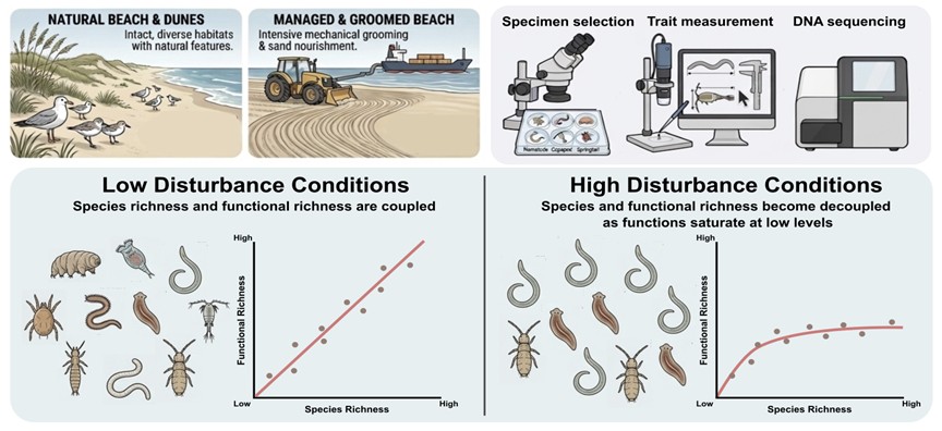 The project relies on sediment sampling across beaches and dunes with varying management intensities. Community composition will be identified using DNA megabarcoding to efficiently capture the full spectrum of species richness. This molecular data will be paired with biological trait analysis and ecological modeling in R to measure functional richness and statistically test for coupling or decoupling across the disturbance gradients.