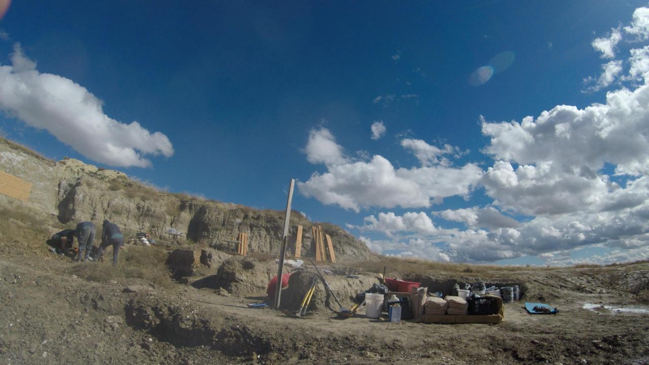 De toon van de opgraving is daarmee wel anders dan dat ie de laatste jaren is geweest. Waar in het verleden nog een zwaartepunt lag bij het ontdekken van nieuwe botten is halverwege de opgraving van 2017 het accent verschoven naar afwikkelen van wat reeds eerder ontdekt was.Dat geeft een andere dynamiek, dwz: minder kick en meer gips. Het klinkt bijna als een klacht. Gelukkig is niets minder waar. In de prairie van Wyoming zo’n klus kunnen en mogen doen is natuurlijk het leukste wat een groepje dinogekken zou willen doen. Vorig jaar hebben we het grote blok deels al gesplitst en het is ook gelukt om enkele delen af te nemen.