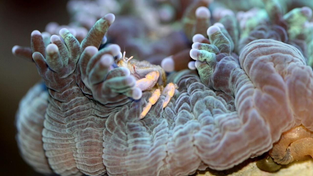 Ook in zeeaquaria worden vaak koralen gehouden. Het groene wonderkoraal (Catalaphyllia jardinei) is een populair koraal bij zeeaquariumliefhebbers door de grote poliepen, mooie tentakels en opvallende kleur. Ook dit koraal wordt bewoond door kleine galkrabben, al is niet elke aquariumhouder blij met deze bewoners uit angst dat ze het koraal beschadigen. Op internetfora duiken regelmatig foto’s op van krabben die met een tandenstoker uit het koraal zijn gepeuterd, maar in sommige gevallen worden ze juist uitgebreid bewonderd en gefotografeerd. Zo ook door de eigenaresse van een Duits zeeaquarium. Zij nam contact op met onze gastonderzoeker Sancia van der Meij (in het dagelijks leven werkt ze aan de Rijksuniversiteit Groningen) nadat ze een galkrab had gevonden in een wonderkoraal in haar aquarium om te vragen om welke soort krab het ging.