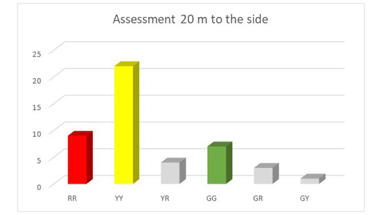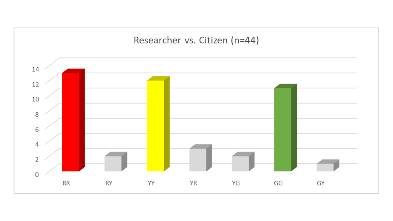 Om de methodiek en bruikbaarheid van het Citizen Science protocol te beoordelen werden van 44 locaties kort na invoering van de data door de vrijwilligers dezelfde plekken opnieuw door de masterstudenten beoordeeld volgens hetzelfde protocol. De resultaten zijn weergegeven in Figuur 6. De letters onder de staven geven respectievelijk de beoordeling van de onderzoeker, gevolgd door de beoordeling van het publiek weer (bijv. RY = door onderzoeker gecategoriseerd als Rood, door het publiek als Yellow/Geel).