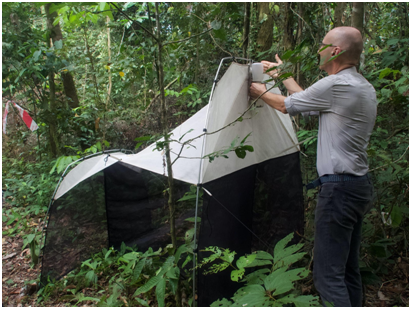 Ik heb ervoor gekozen om deze ochtend mee te gaan naar de malaiseval. Het is 8:00 als Menno en Jeremy ons meenemen naar de val die in de dagen ervoor is opgezet. Het gebruik van deze val biedt een manier om zonder lokmiddelen insecten te kunnen vangen om ze vervolgens te determineren en inzicht te krijgen in de insectendiversiteit. De insecten vliegen tegen de malaiseval aan en proberen dan te ontsnappen door omhoog te vliegen. Helaas voor hen bevindt zich bovenaan een fles met alcohol waar ze nietsvermoedend in vallen. Nu de val al een paar dagen staat, is het aan Jordy en mij de taak om de malaiseval af te breken en in te pakken, de fles met alcohol en beestjes voorzichtig te verwijderen en alles mee te nemen.