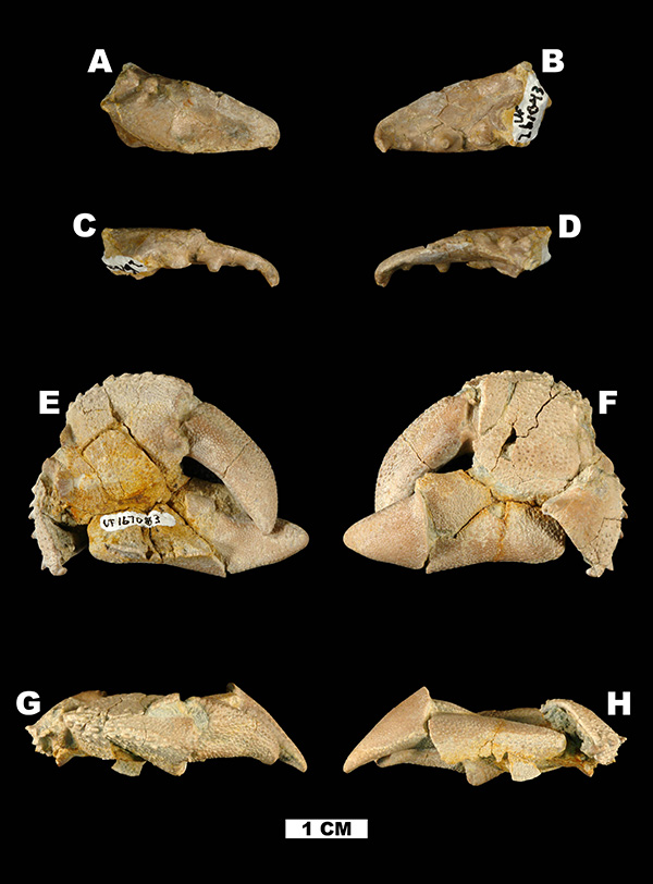 Decapod crustacean (crab) remains from the Middle Eocene Litchfield Formation, Yellow Limestone Group at Seven Rivers, parish of St. James, western Jamaica. Specimens in the collection of the Florida Museum of Natural History, Gainesville. A-D Callianassid sp. indet., limb fragments of a mud shrimp. E-H Diogenid gen. et sp. nov., claw of a hermit crab.  (After Donovan & Portell, 2019, Swiss Journal of Palaeontology, fig. 1.)